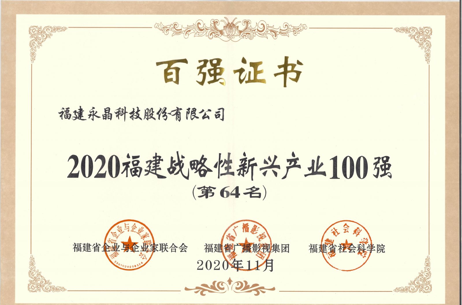 11月21日,2020福建企業100強發布大會暨福建企業家大講壇在福建省寧德市舉行。會上,省企業與企業家聯合會聯合福建省社會科學院發布了“2020福建企業100強”、“福建制造業企業100強”、“福建服務業100強”及“福建戰略性新興產業領軍企業100強”四大榜單,永晶科技榮獲“2020福建戰略性新興產業領軍企業100強”。